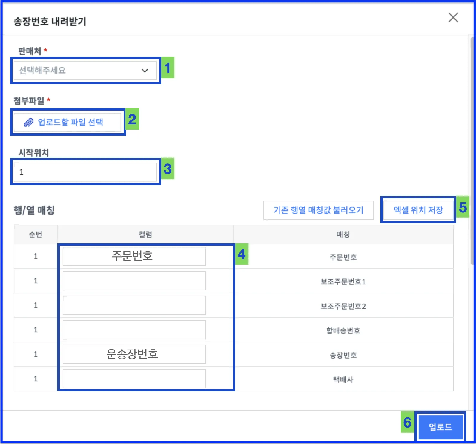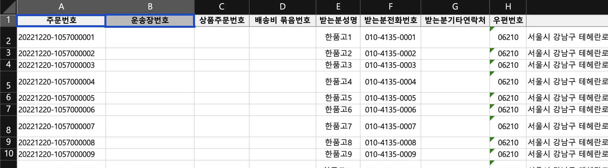 예시) 주문번호 → 주문번호, 송장번호 → 운송장번호