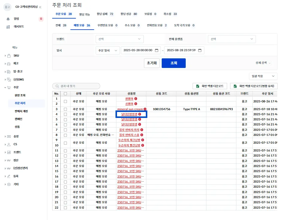 주문 오류 및 송장 할당 관련하여 처리가 필요한 주문이 있다면, 해당 페이지 내에서 처리가 가능합니다.
