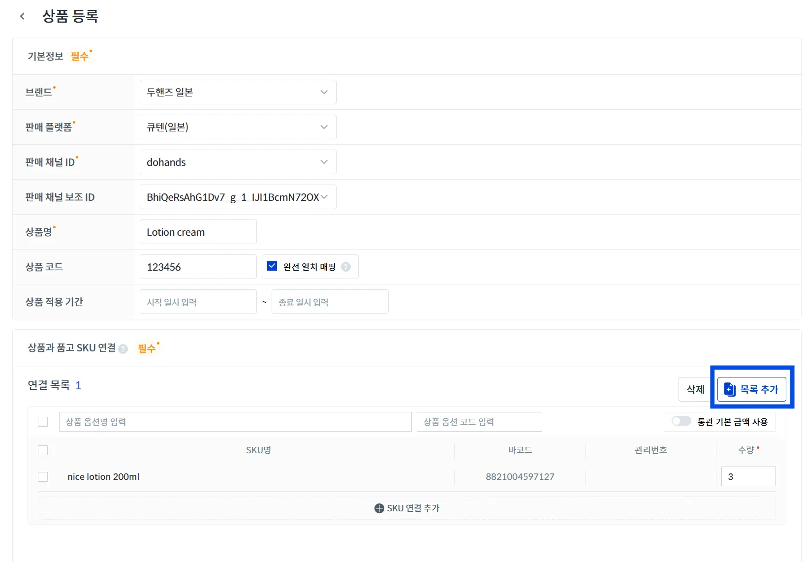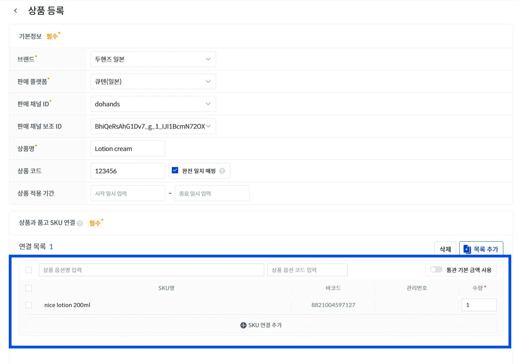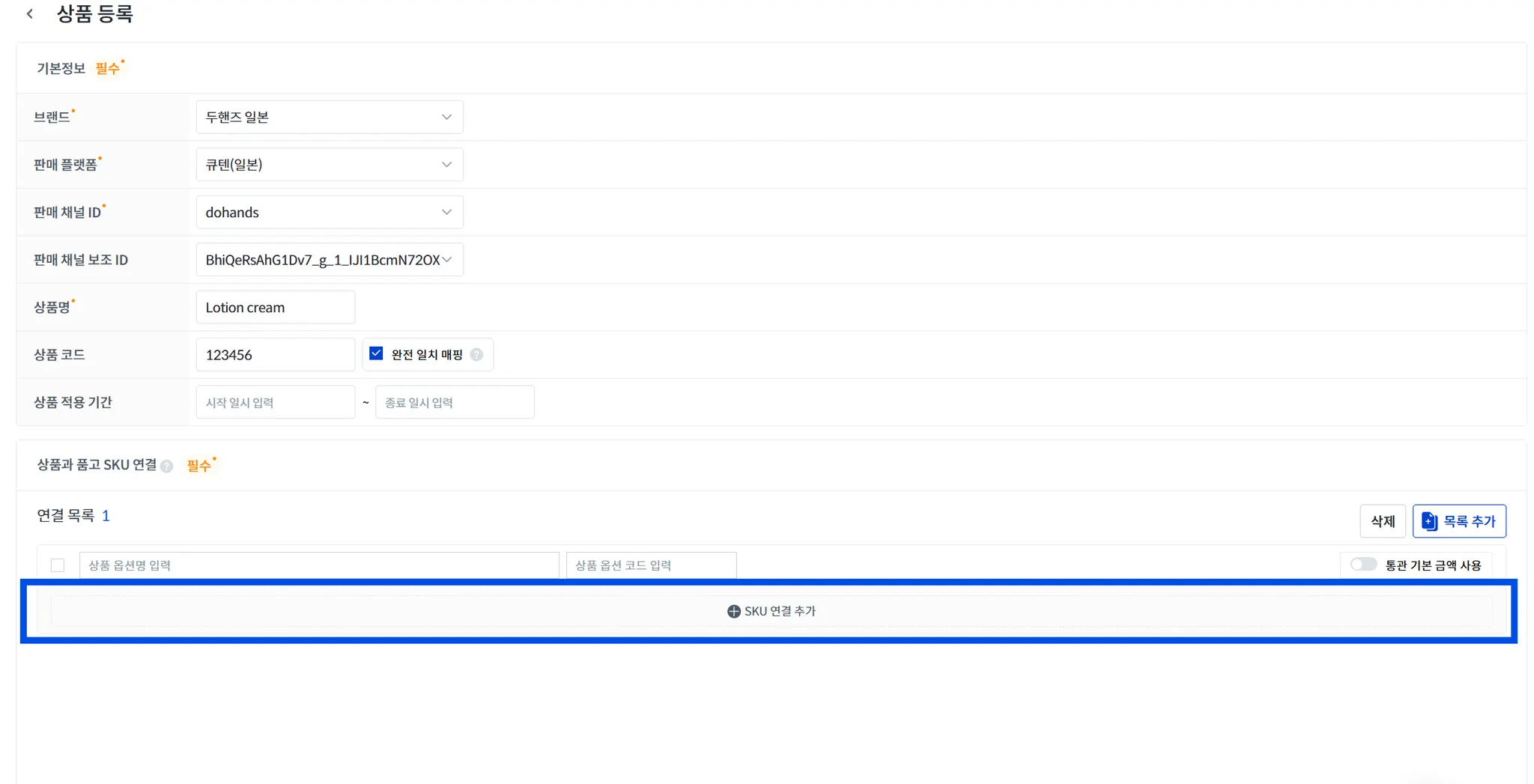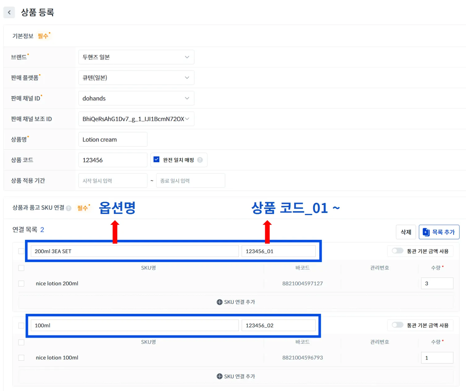 연결 목록에 2개 이상의 SKU가 있을 때는 [상품 옵션명]과 [상품 옵션 코드]를 반드시 입력해야 합니다.