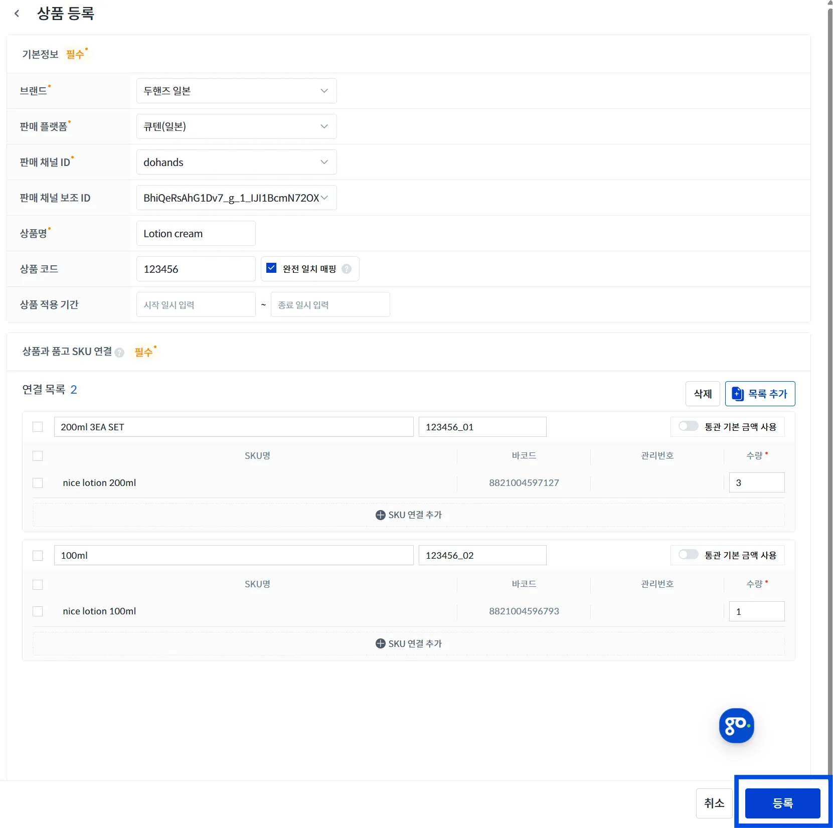 예시) 아래 이미지 기준으로 주문 1건 당 Lotion 200ml 3개 출고 진행