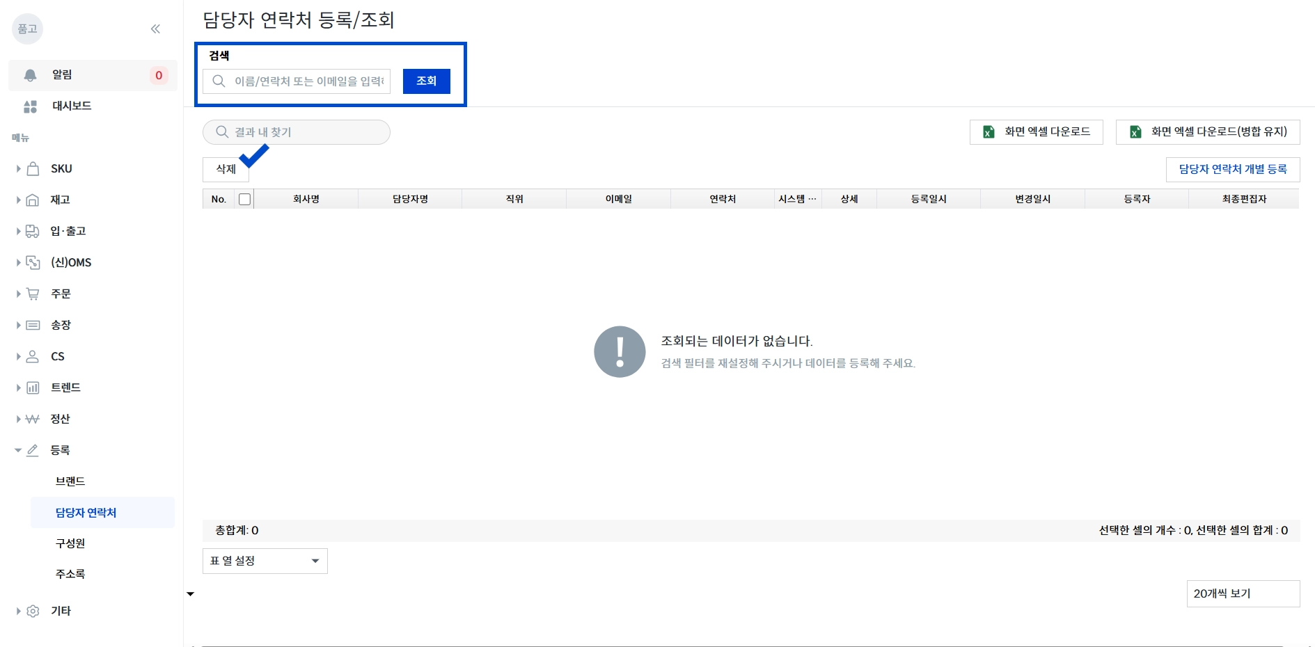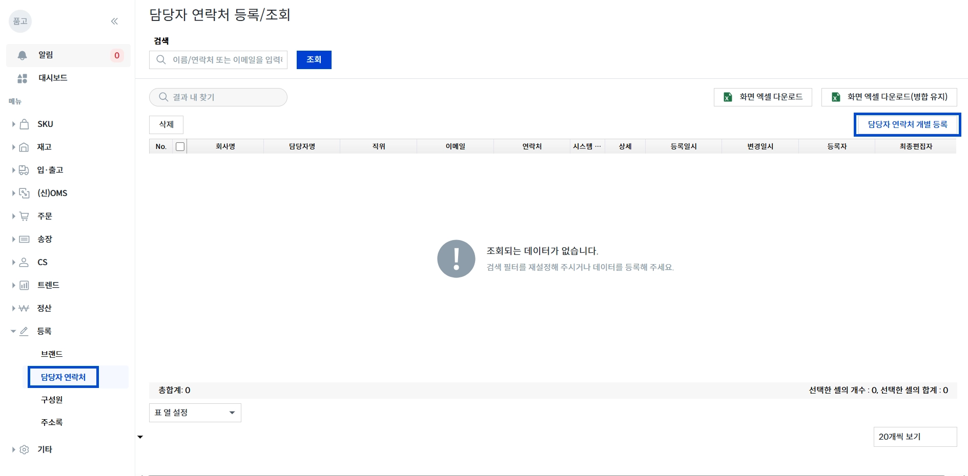 왼쪽에서 [등록 → 담당자 연락처 → 담당자 연락처 개별 등록] 클릭해 주세요.
