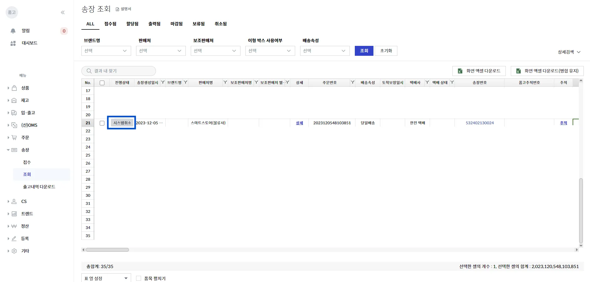[1] 품고 나우 > 송장 > 조회 > ALL 탭에서 시스템 취소 여부를 확인해 주세요.