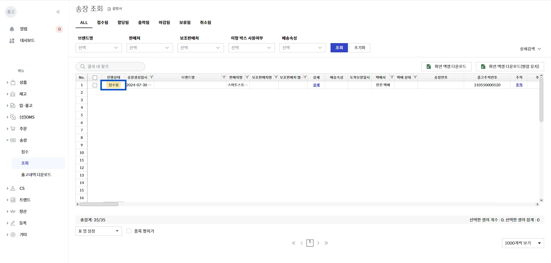 [5]품고나우 > 송장 > 조회 > ALL 탭에서 접수됨 여부를 확인해 주세요.