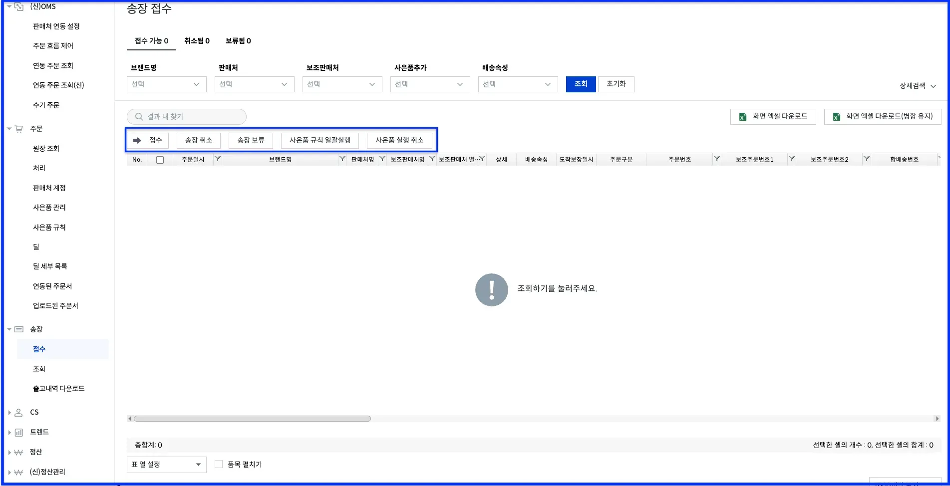 접수 가능 탭의 [접수] [송장 취소] [송장 보류] [사은품 규칙 일괄실행] [사은품 실행 취소] 버튼 제거