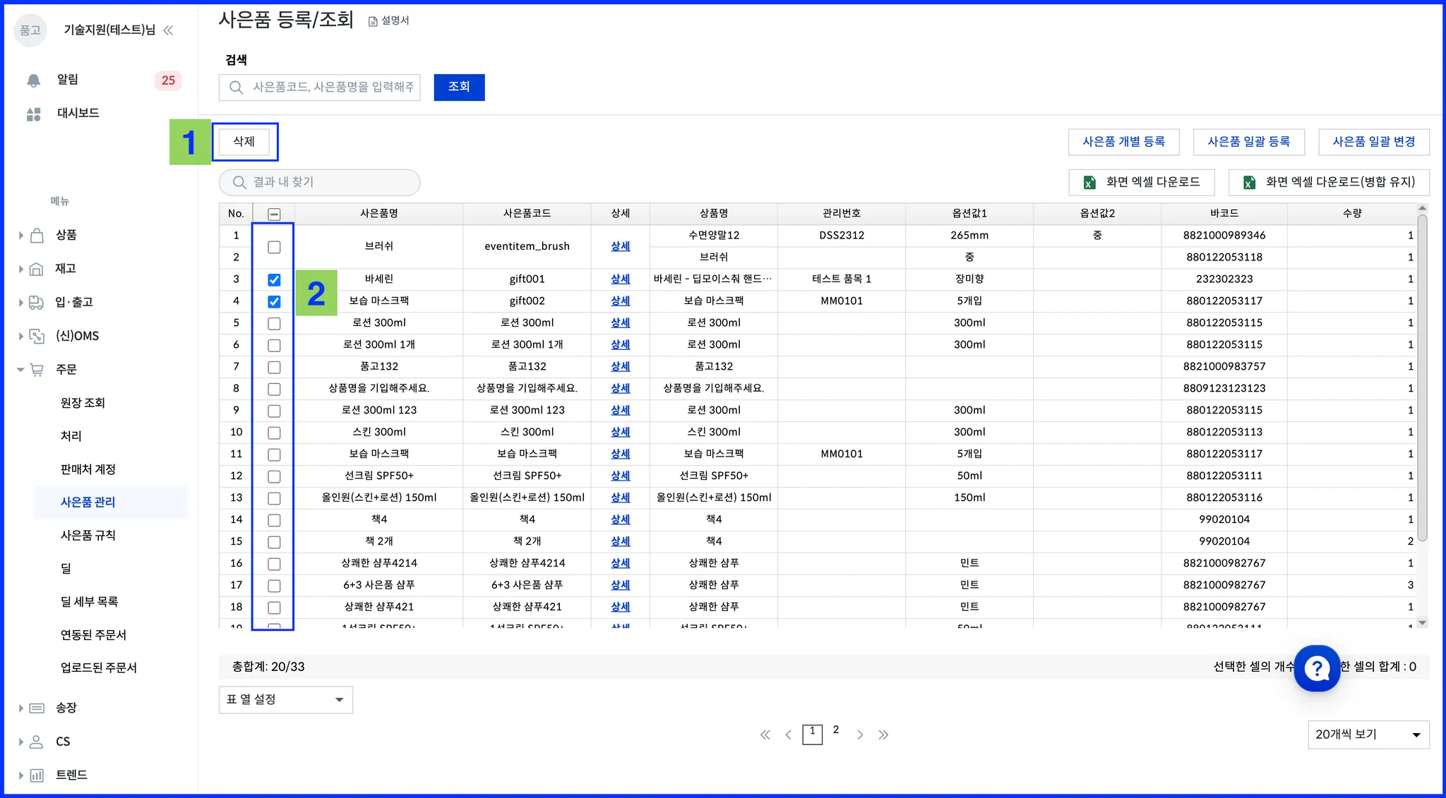 조회 후, 삭제 할 사은품 선택