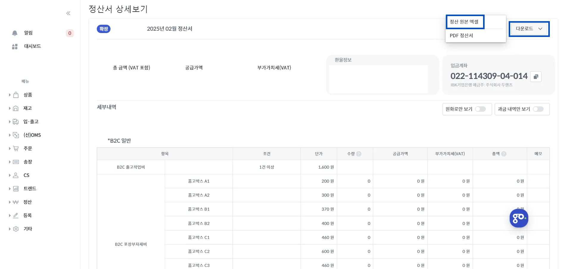 [3] 우측 상단 다운로드 > 정산원본 엑셀