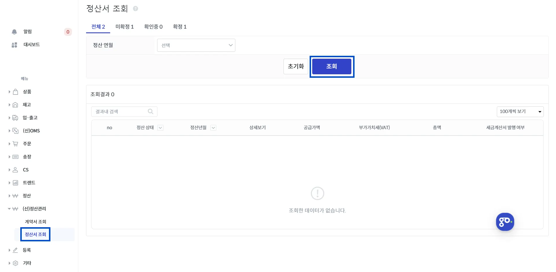 [1] 품고 나우 > (신)정산관리 > 정산서 > 조회