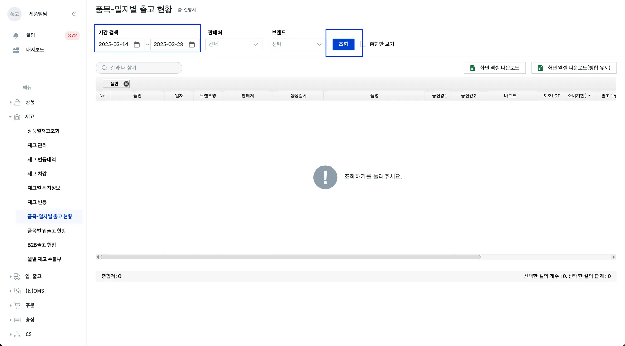 품고 나우 > 재고 > 품목-일자 별 출고 현황 > 기간 검색 설정 > 조회