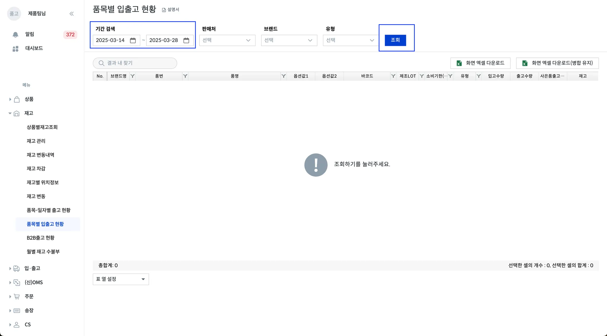 품고 나우 > 재고 > 품목별 입출고 현황 > 기간 검색 설정 > 조회