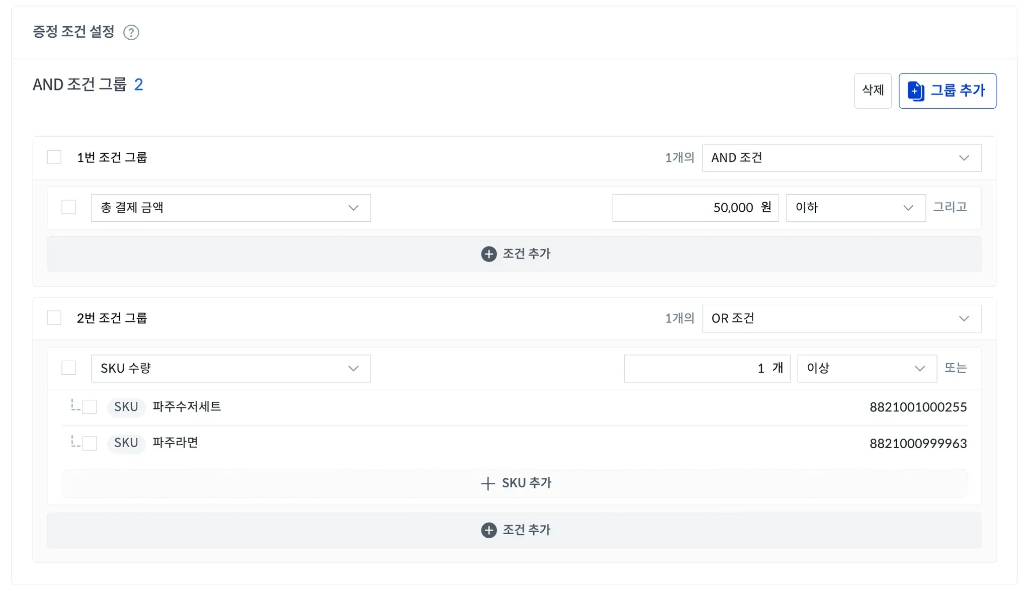 → 총 결제 금액 50,000원 이상이고, 2번 그룹의 4개 SKU 중 아무거나 1개 이상 구매 시 사은품 증정