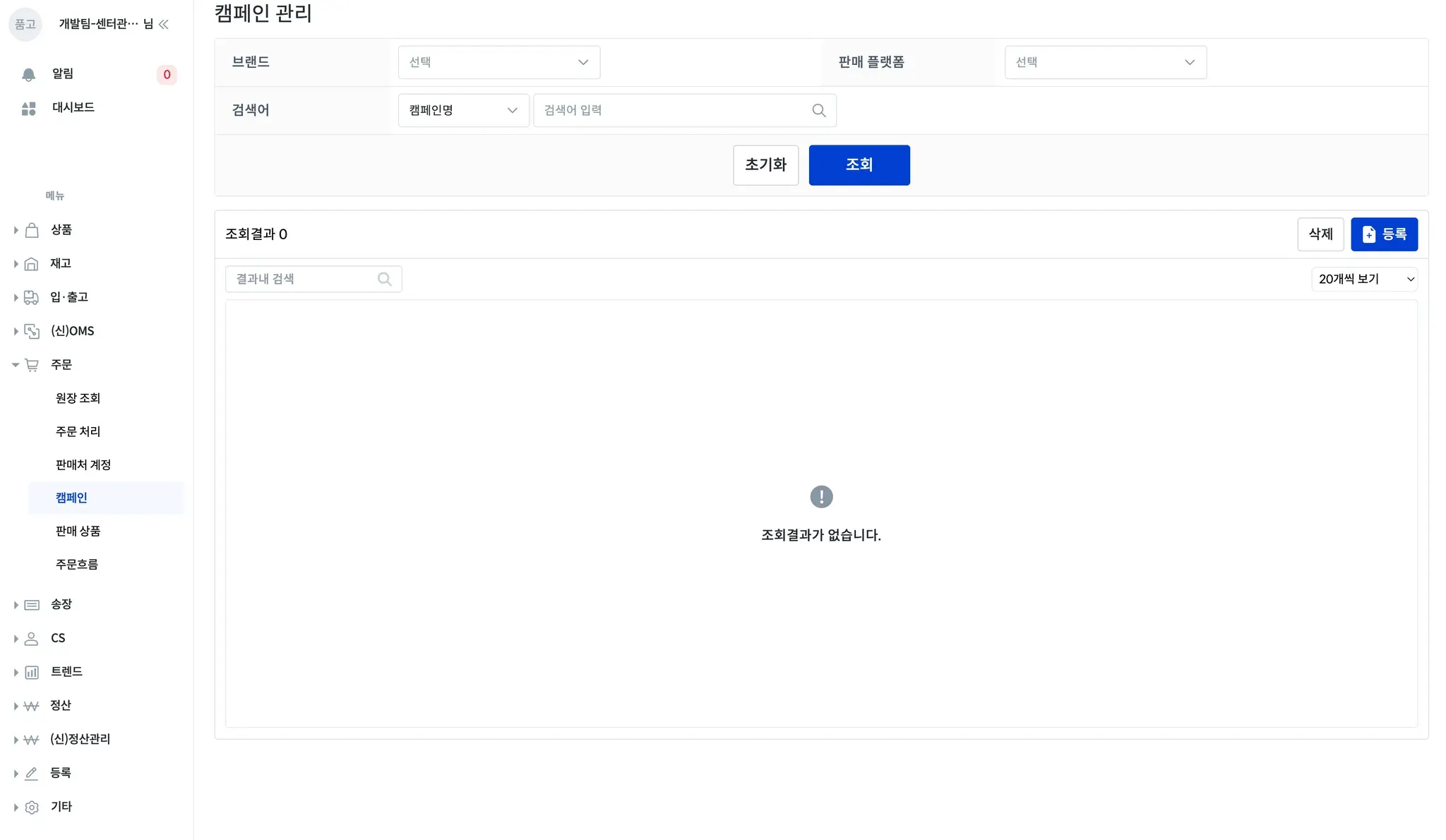 품고나우 좌측 [주문 → 캠페인]으로 이동하여, [등록]을 클릭해 주세요.