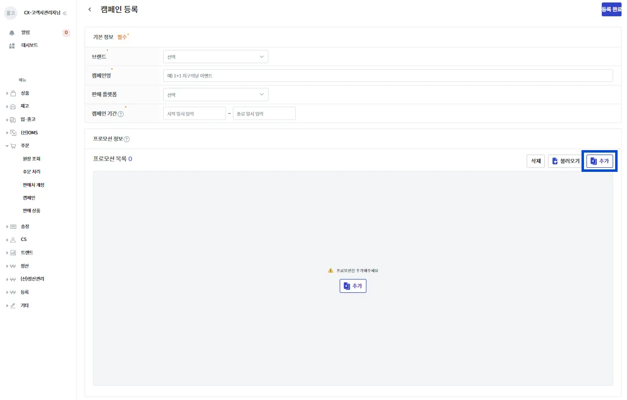 모든 예시는 [주문 → 캠페인] 내 프로모션의 [추가]를 누른 뒤의 화면입니다.