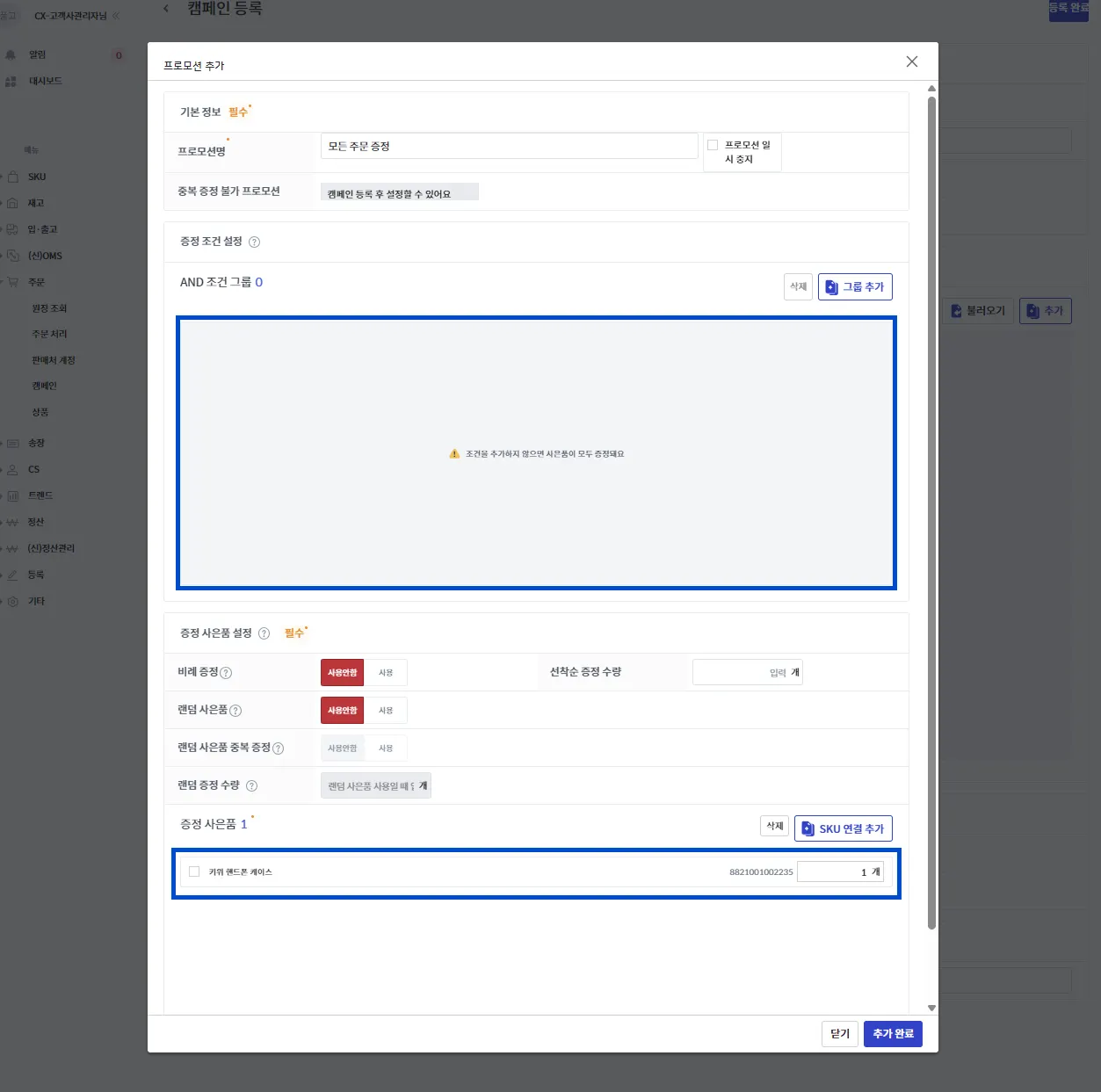 프로모션 조건 그룹에 아무것도 추가하지 않고 [증정 사은품]을 설정하면 캠페인에 설정된 판매처로 들어온 모든 주문에 프로모션이 적용됩니다.