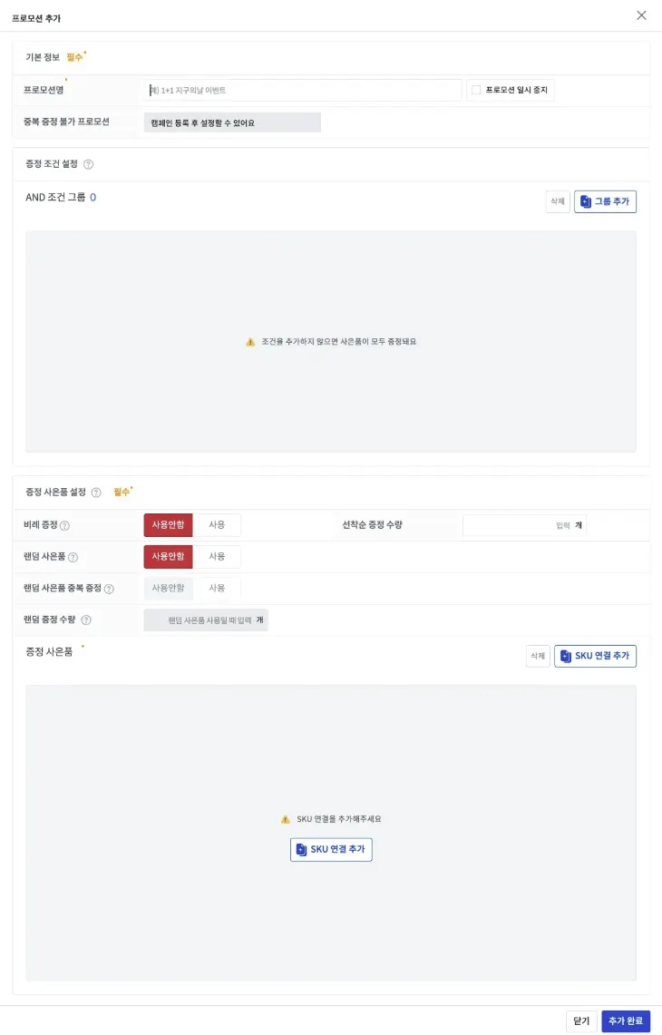 프로모션 정보 | 추가 | 캠페인이 진행될 때 제공되는 사은품이 있다면 프로모션을 함께 설정해 주세요. |