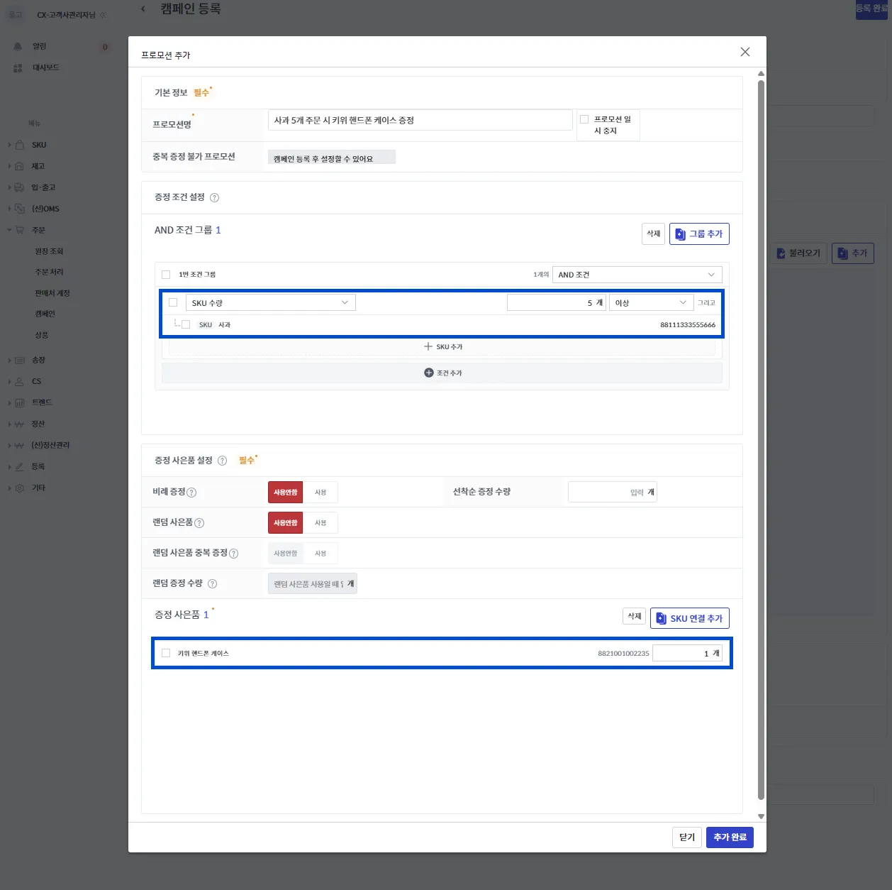 등록한 캠페인 내 사은품 증정이 있는 경우, 프로모션을 추가하여 관리할 수 있습니다.