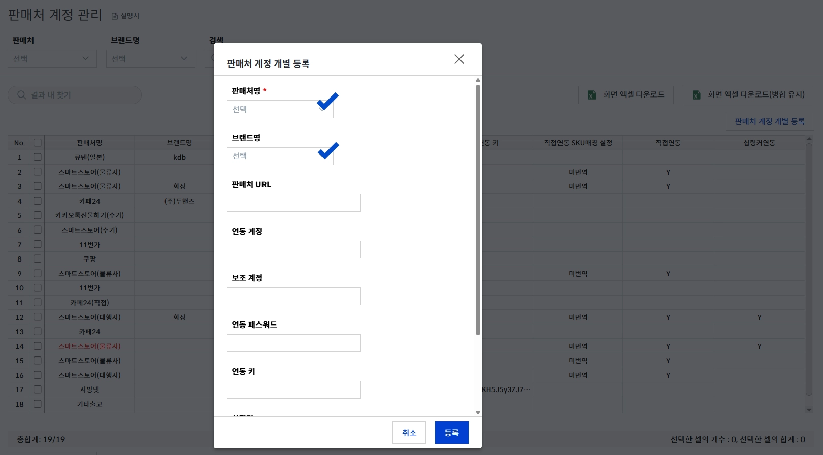 [판매처명] [브랜드]에 등록하려는 판매처명과 브랜드를 선택해 주세요.