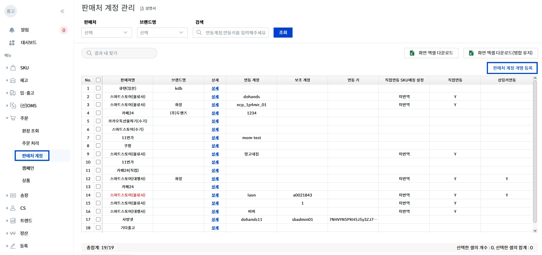 운영 중인 판매처 연동 전 계정 관리 등록을 먼저 진행해 주세요.