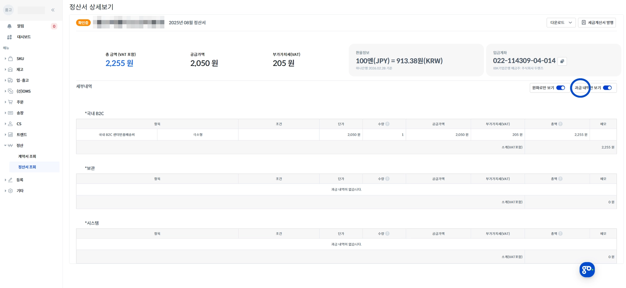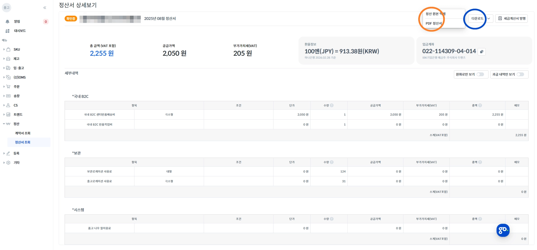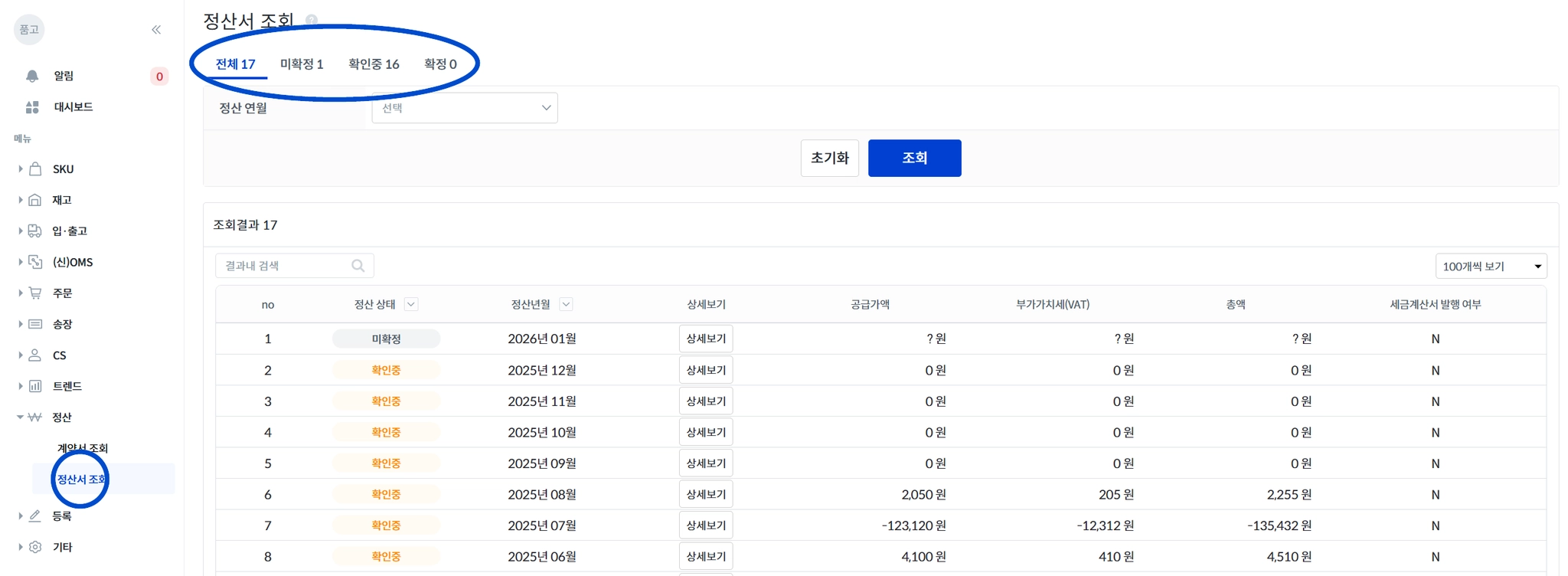 왼쪽 메뉴 [정산 → 정산서 조회] 접속합니다.