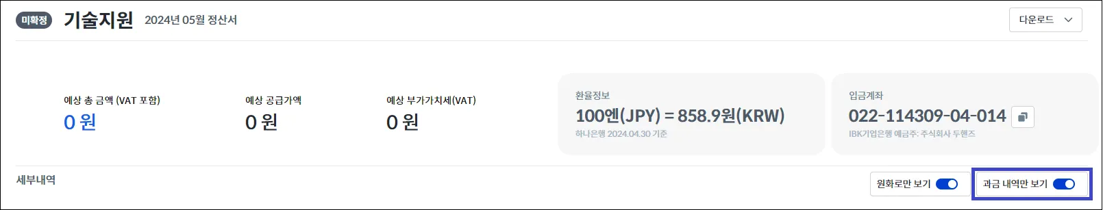 정산서 상세보기 클릭 후, 월 별 정산서 상단의 ‘과금 내역만 보기’를 체크하시면 간결한 정산 내역을 볼 수 있어요