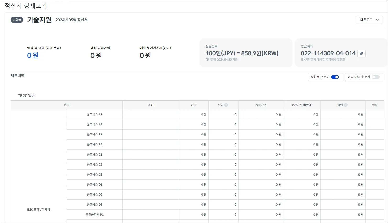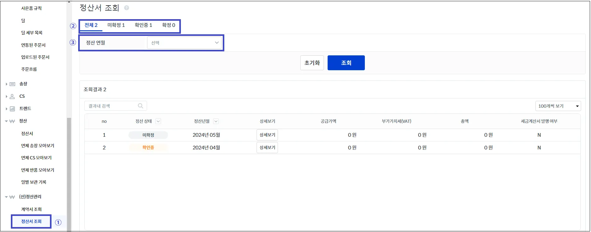 정산서는 매월 1일 04시 자동으로 생성됩니다. (정산서 상태 : 확인중)