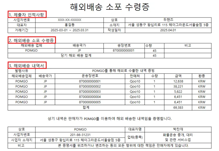 해외배송 소포 수령증 : 실제 물품이 발송되었는지 확인이 가능하며, 배송 건수와 수량을 확인할 수 있습니다.