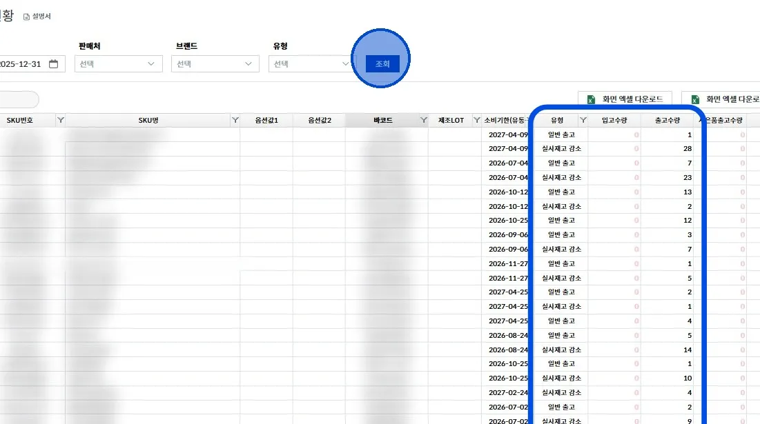 SKU별로 입고와 출고에 대한 수량과 그 유형을 조회할 수 있어요.