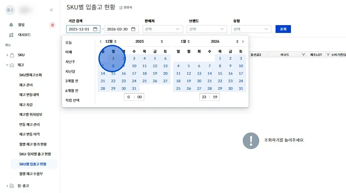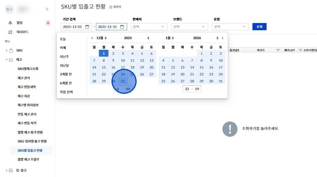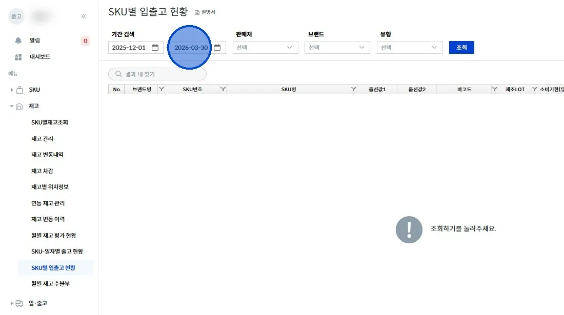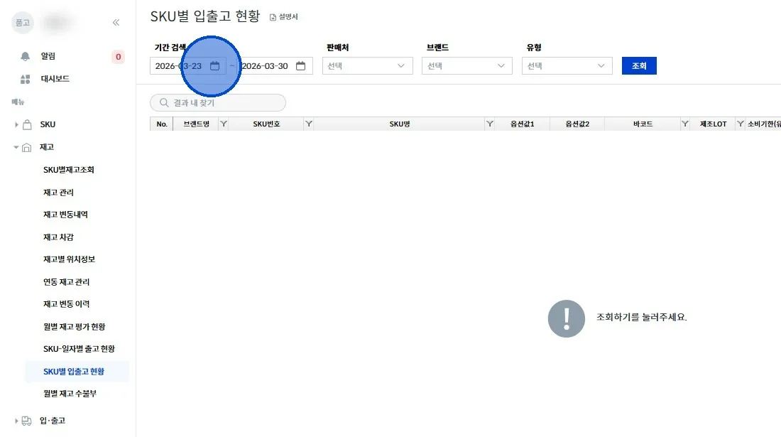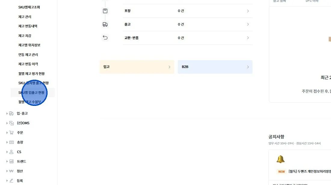 좌측 메뉴에서 [재고 → SKU별 입출고 현황] 클릭해 주세요.