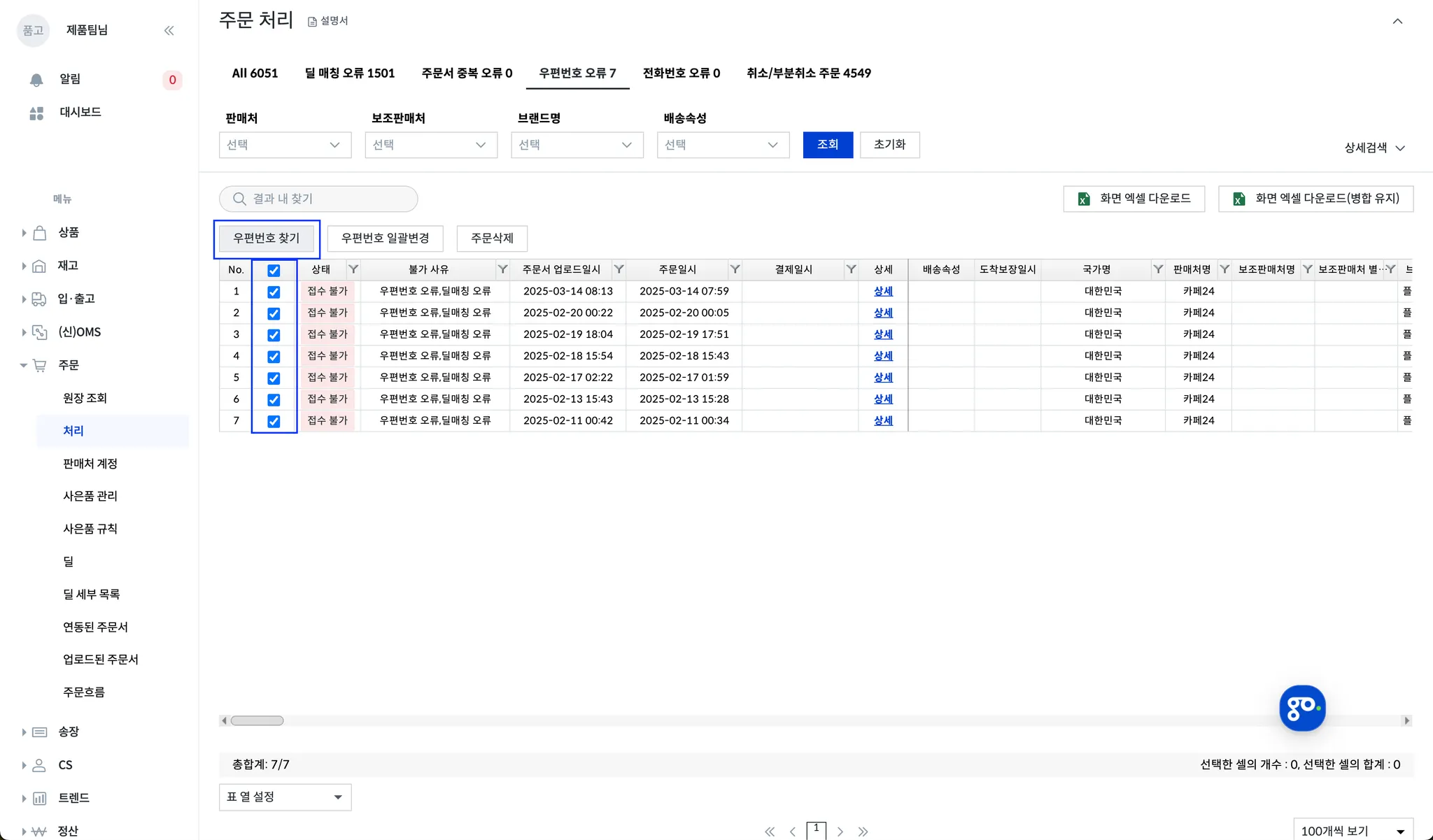 [1] 품고 나우 > 주문 > 처리 우편번호 오류 탭 클릭