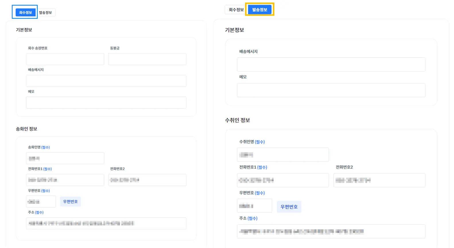 [4] 불러온 정보 확인한 후, 회수정보 및 발송정보에서 상품 추가 및 삭제 가능