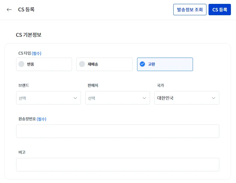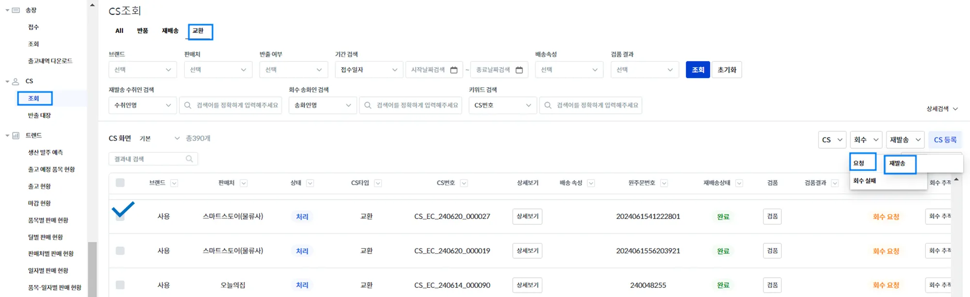 [6] CS > 조회 > 교환 탭에서 오른쪽 회수, 재발송 버튼 각각 클릭하여 최종 접수 진행