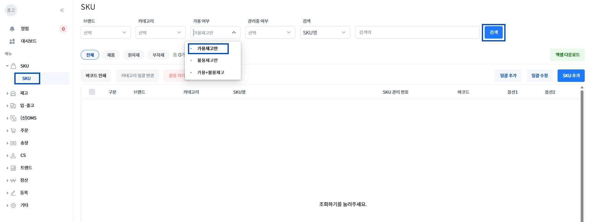 [SKU → SKU] 가용 여부를 [가용재고만]으로 설정 후 [검색]을 클릭하여 가용 상품을 조회해 주세요.