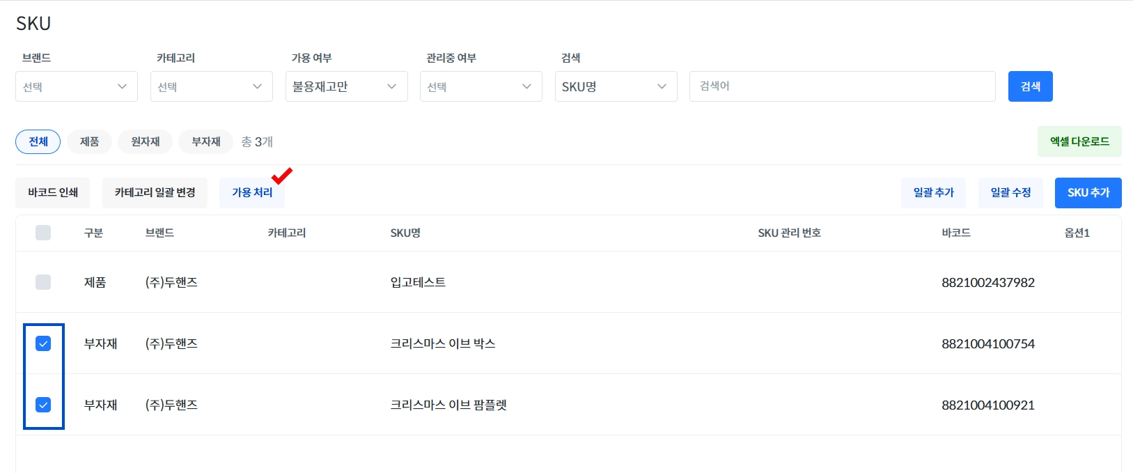 가용 처리가 필요한 상품을 체크 후 [가용 처리] 버튼을 클릭하여 상품을 다시 운영 합니다.