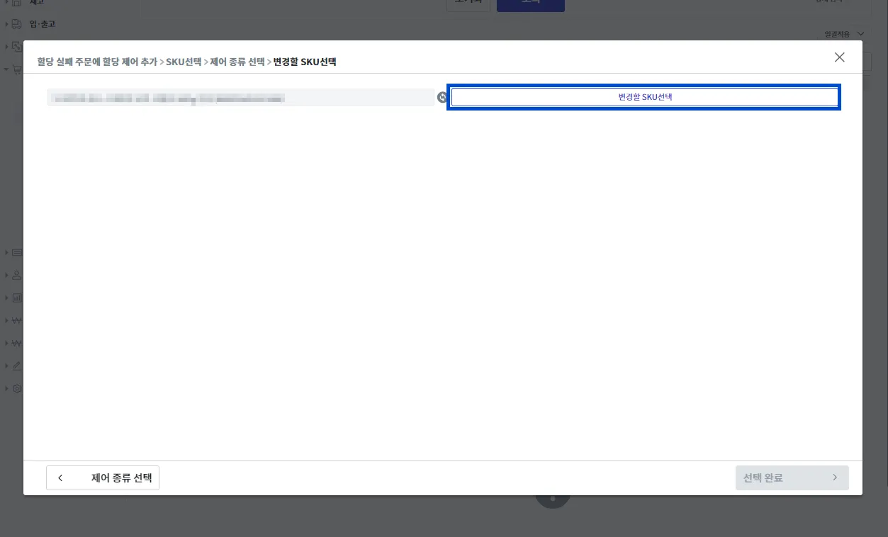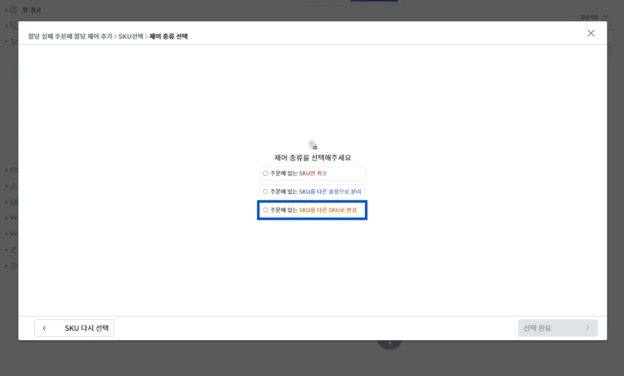 제어 종류 중 [주문에 있는 SKU를 다른 SKU로 변경]을 선택 후 [선택 완료]를 눌러주세요.