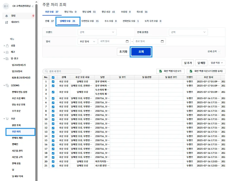 품고나우 좌측 [주문 → 주문 처리 → 주문 오류 → 딜매칭 오류]를 클릭 후 [조회]를 눌러주세요.