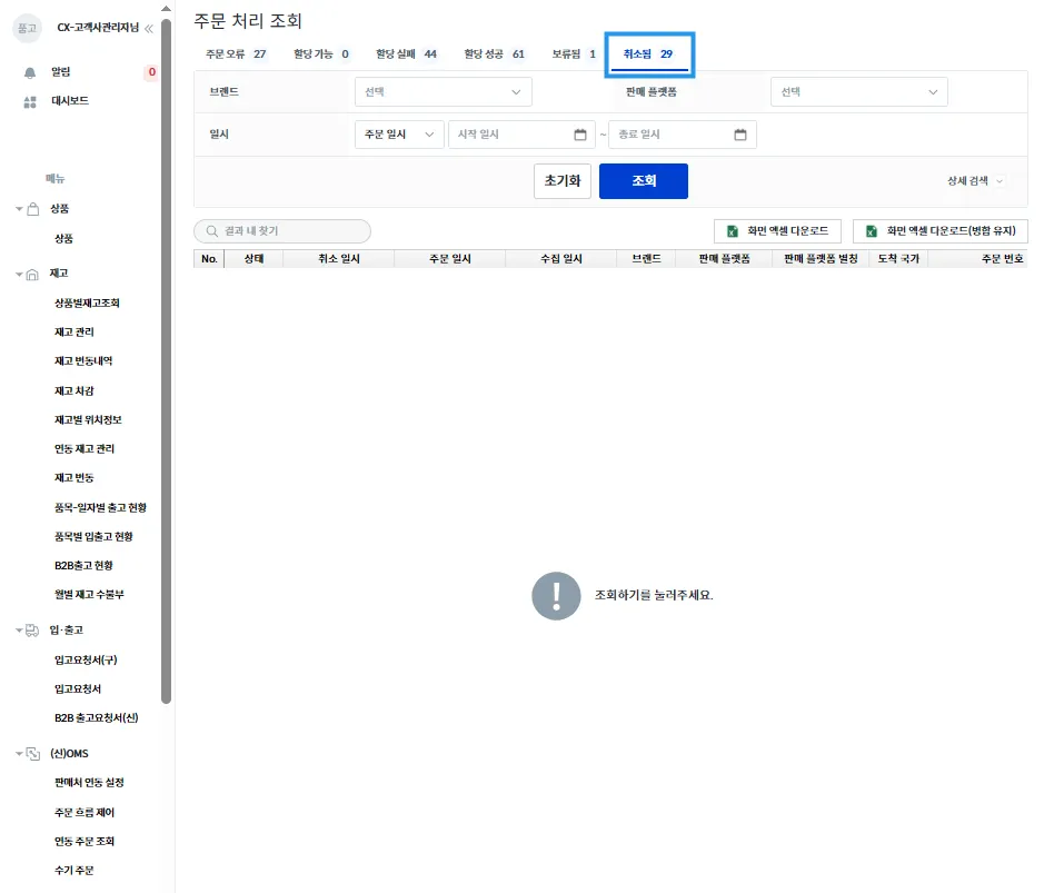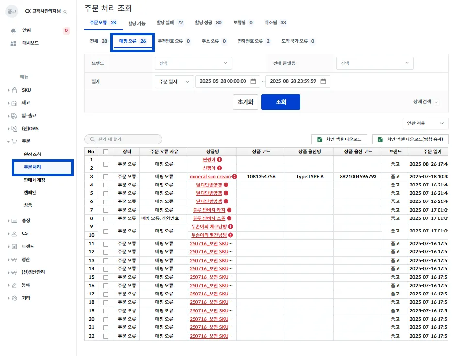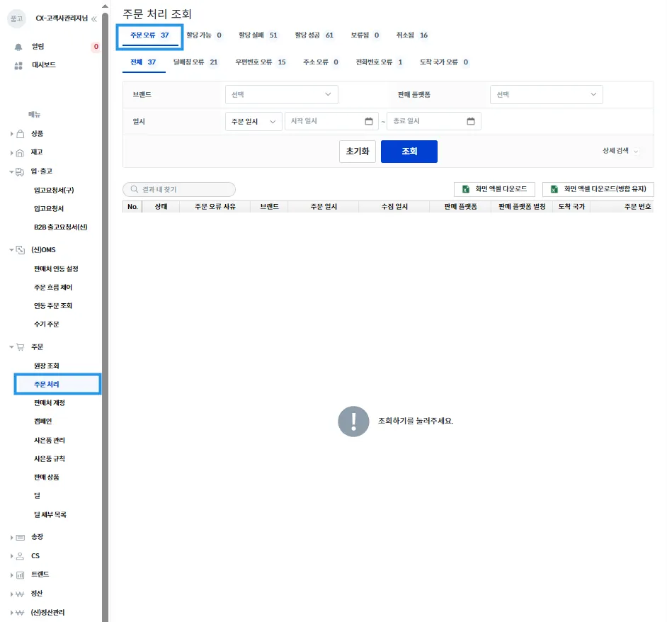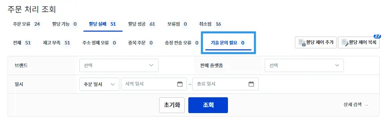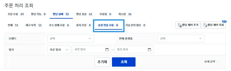 주문 오류 및 송장 할당 관련하여 처리가 필요한 주문이 있다면, 해당 페이지 내에서 처리가 가능합니다.