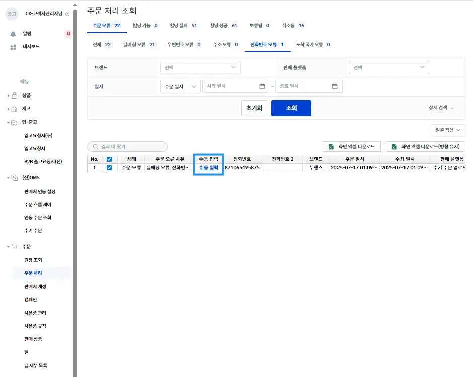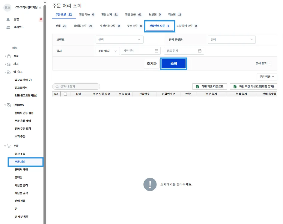 품고나우 좌측 [주문 → 주문 처리 → 주문 오류 → 전화번호 오류]를 클릭 후 [조회]를 눌러주세요.