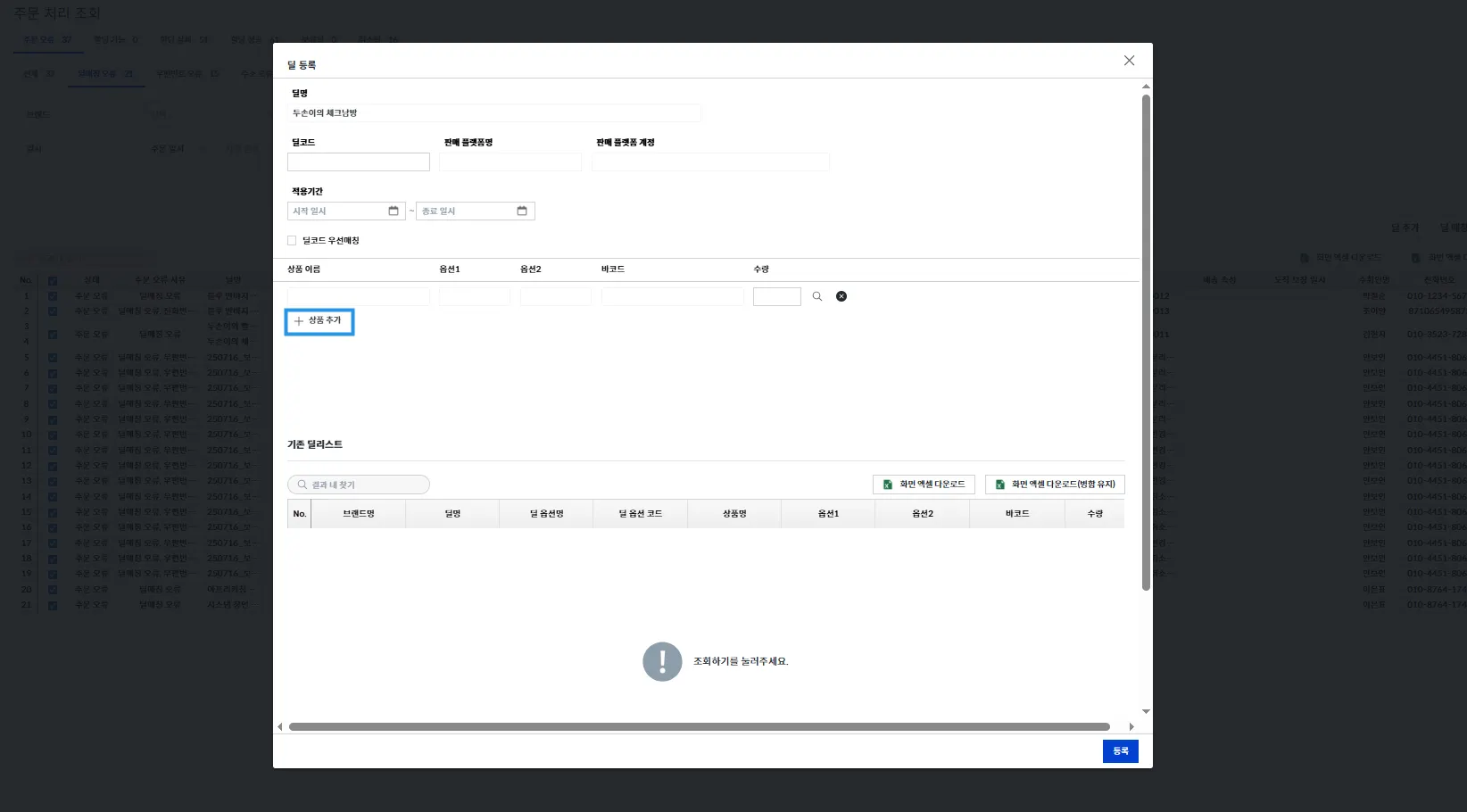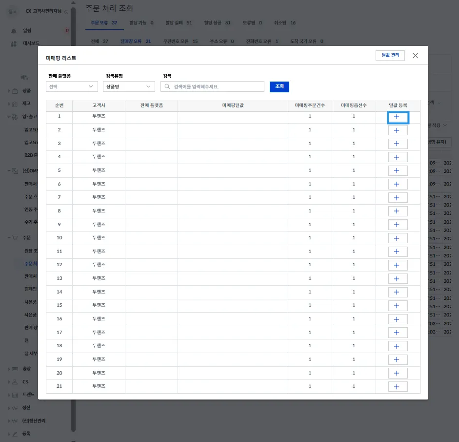 [등록] 버튼을 누르면 딜이 추가되고, 해당되는 주문들의 딜매칭 오류가 해결됩니다.