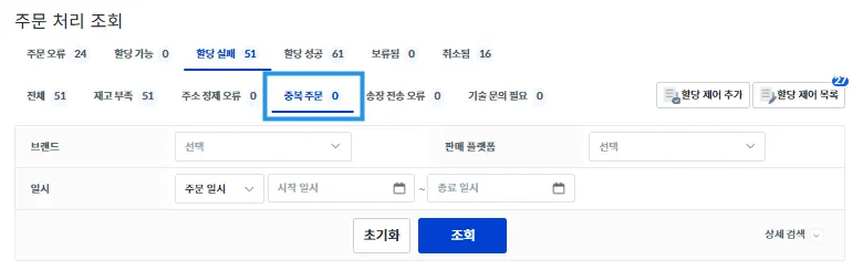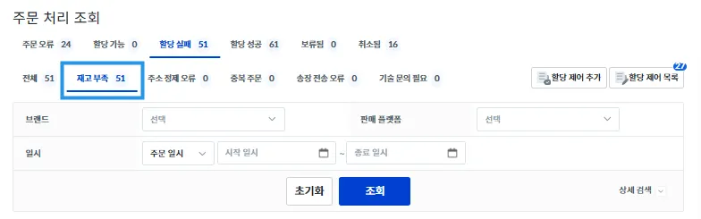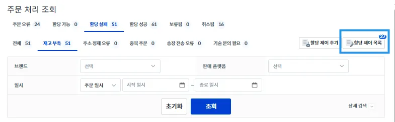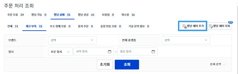 실패 사유에 따라 처리가 필요하다면 우측 상단의 [할당 제어 추가], [할당 제어 목록]을 통해 주문을 수정하여 할당을 다시 시도할 수 있습니다.