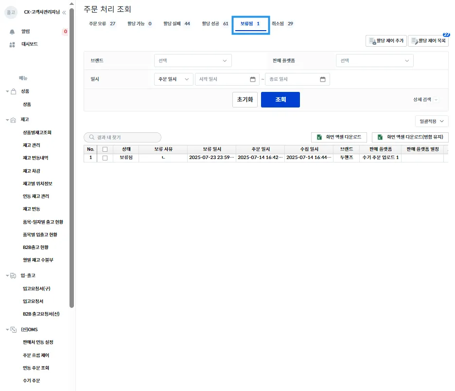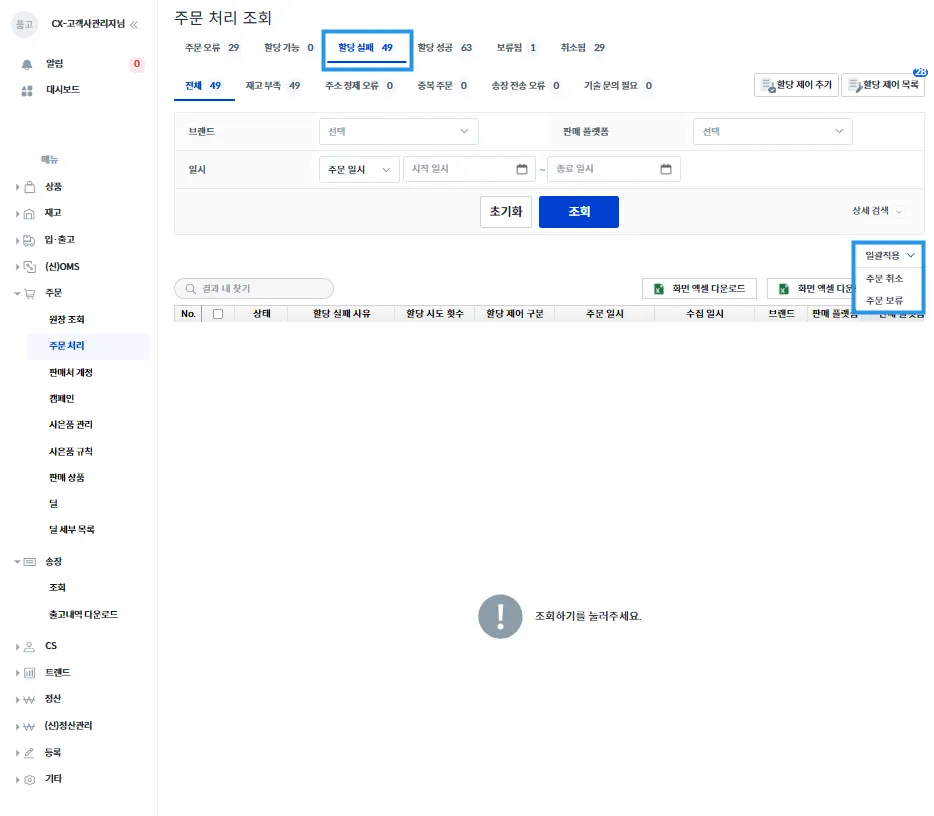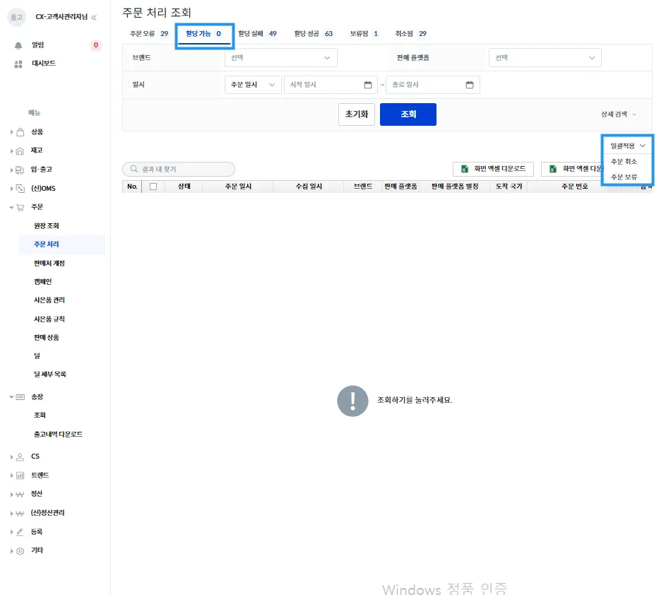 주문 오류가 해결되었을 때 [할당 가능] 탭에 뜨게 되며, 주문 취소나 주문 보류가 가능합니다.