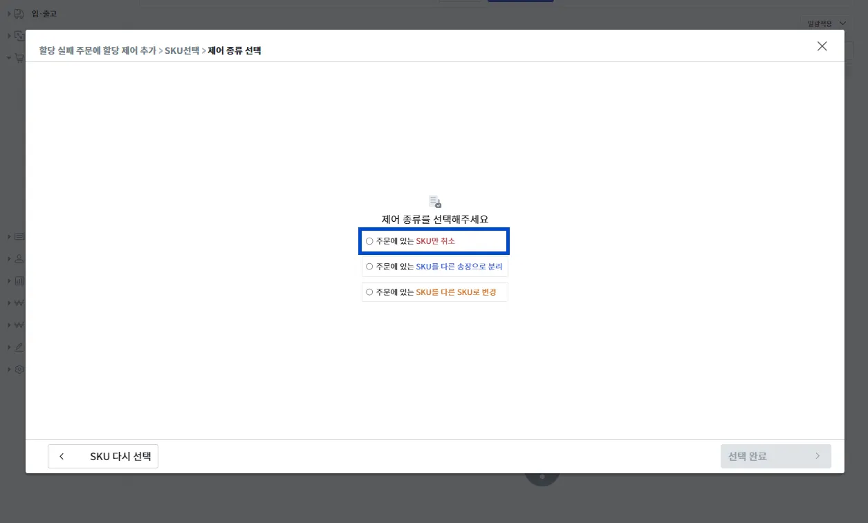 제어 종류 중 [주문에 있는 SKU만 취소]를 선택 후 [선택 완료]를 눌러주세요.