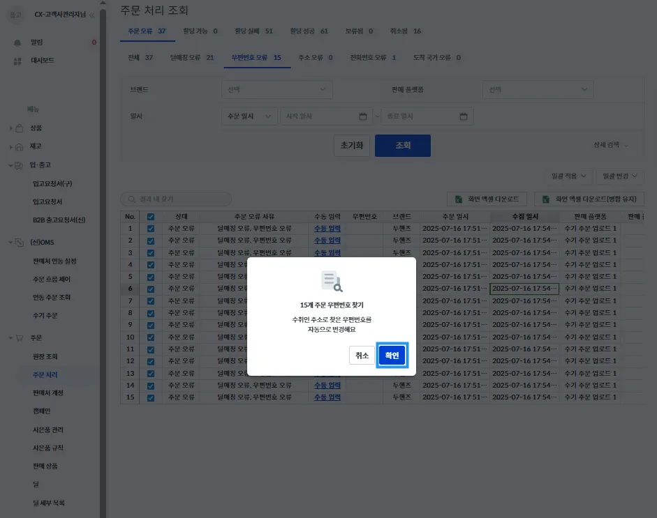 우편번호 오류가 있는 주문 건을 모두 체크하고 우측 중간의 [일괄 변경 → 우편번호 찾기]를 클릭해 주세요.