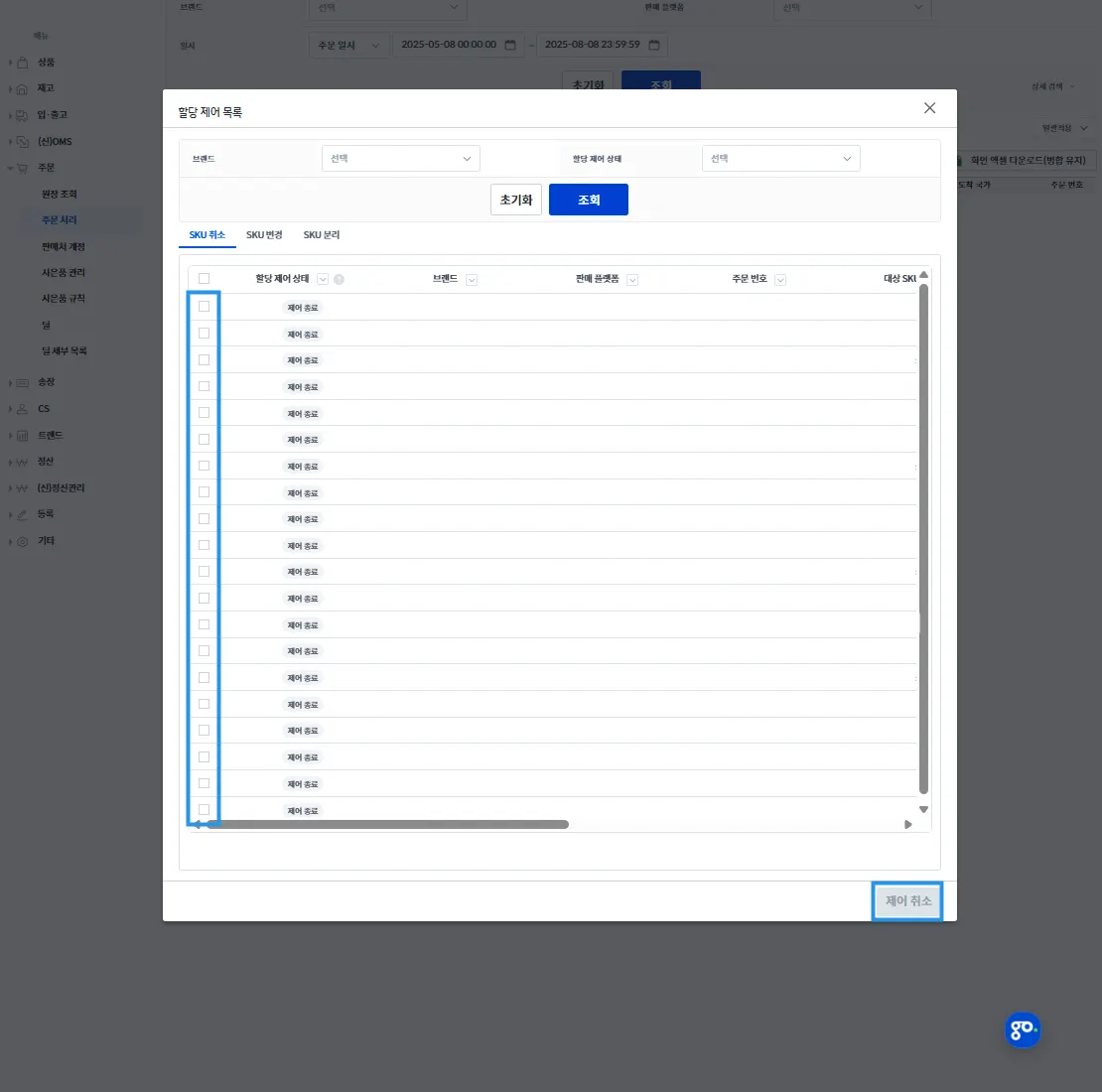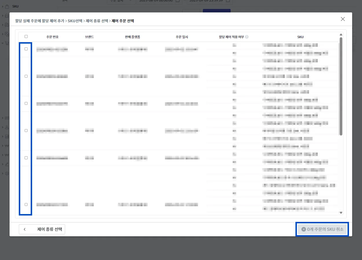할당 제어 목록에서 다시 할당이 필요 없는 경우, [제어 취소] 버튼을 눌러 해당 SKU의 재할당을 막을 수 있습니다.