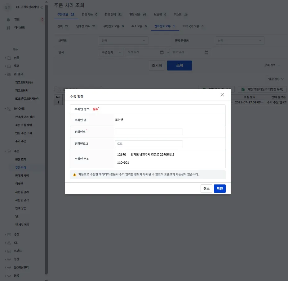 품고나우 좌측 [(신)OMS → 연동 주문 조회 → 정상] 으로 접속 후 [수동 입력] 버튼을 선택해 수취인 정보를 변경해 주세요.