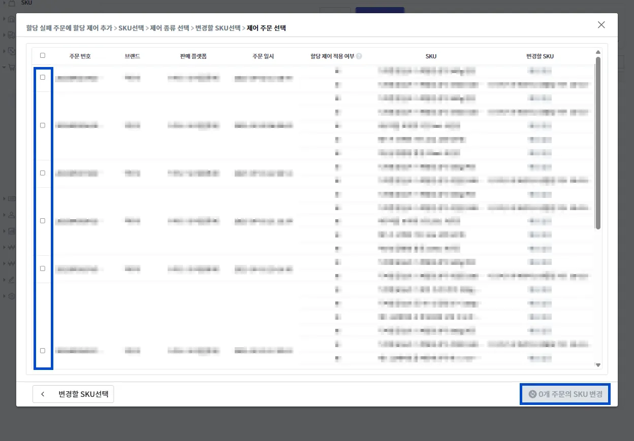 이후 SKU 변경을 진행할 주문을 모두 체크 후 [n개 주문의 SKU 변경]을 눌러주세요.