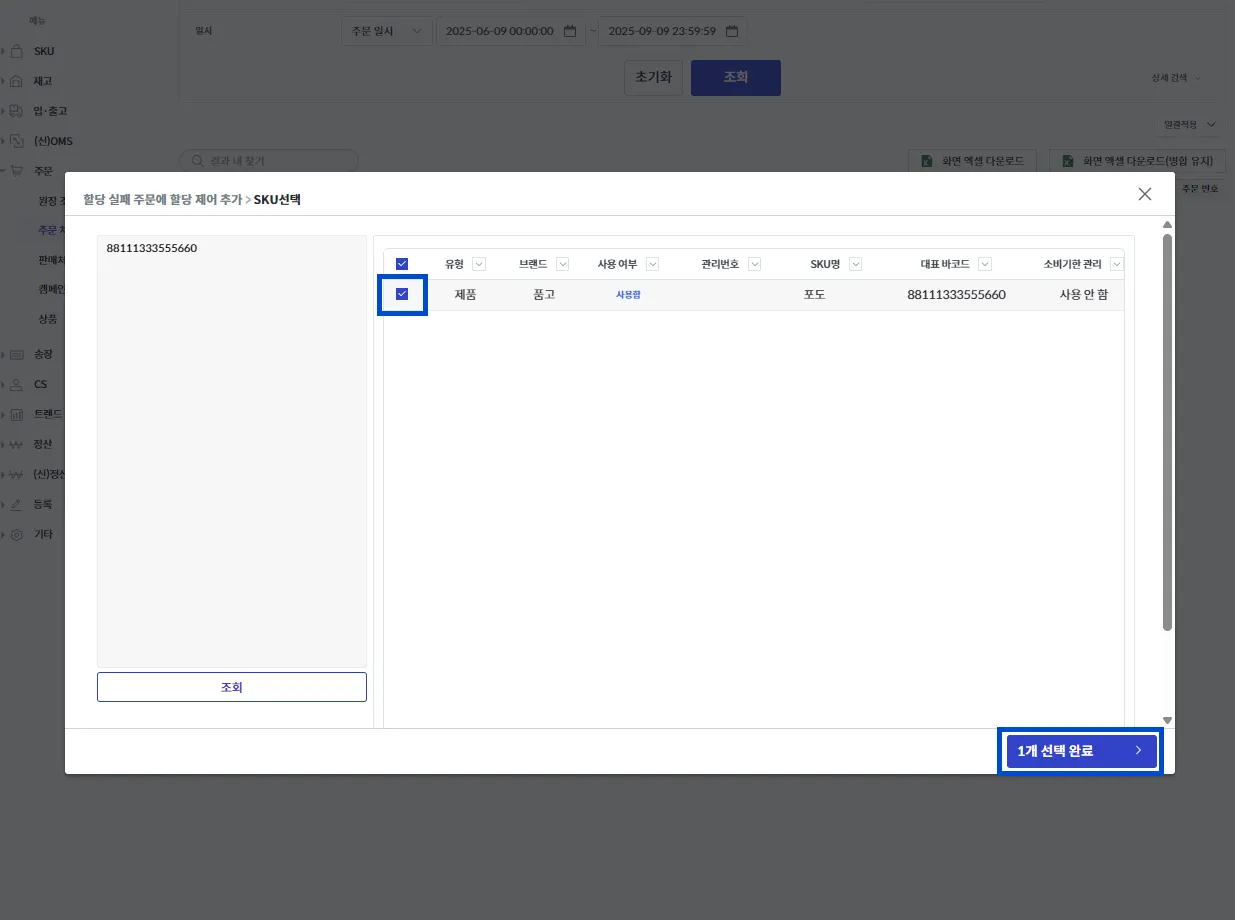 이후 뜨는 팝업창의 왼쪽에서 취소를 진행할 SKU 바코드를 검색 후 [조회], 오른쪽에서 SKU를 선택 후 [n개 선택 완료]를 눌러주세요.