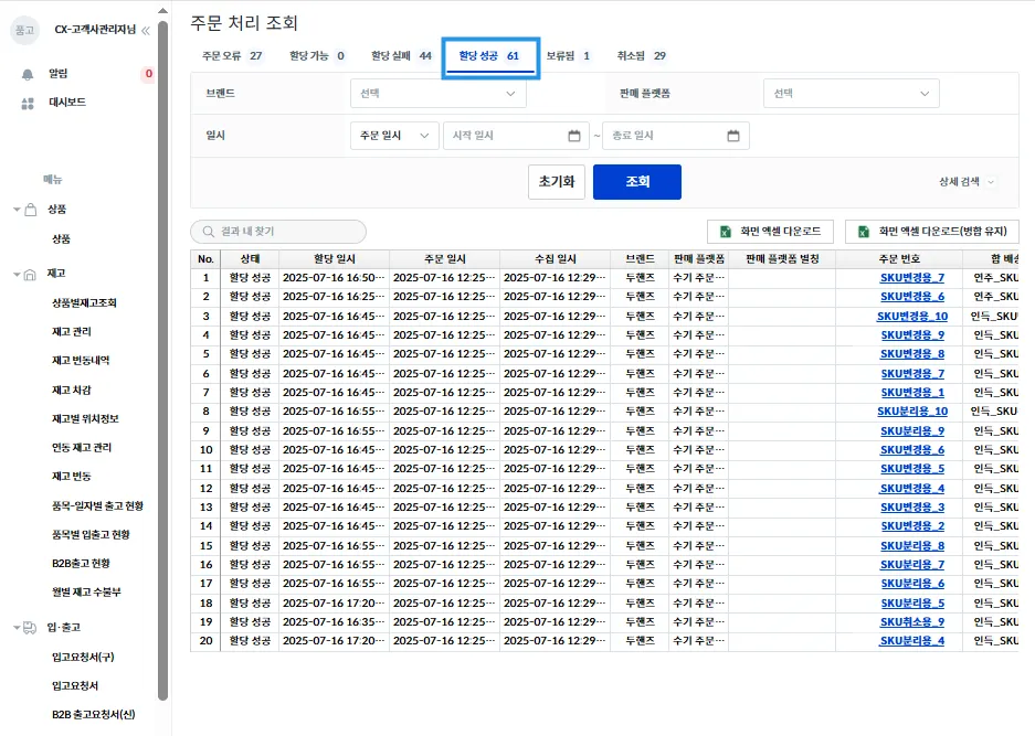 할당 성공이 뜬 주문들은 약 5분 뒤 [송장 → 조회]에서 [할당됨] 상태로 확인이 가능합니다.