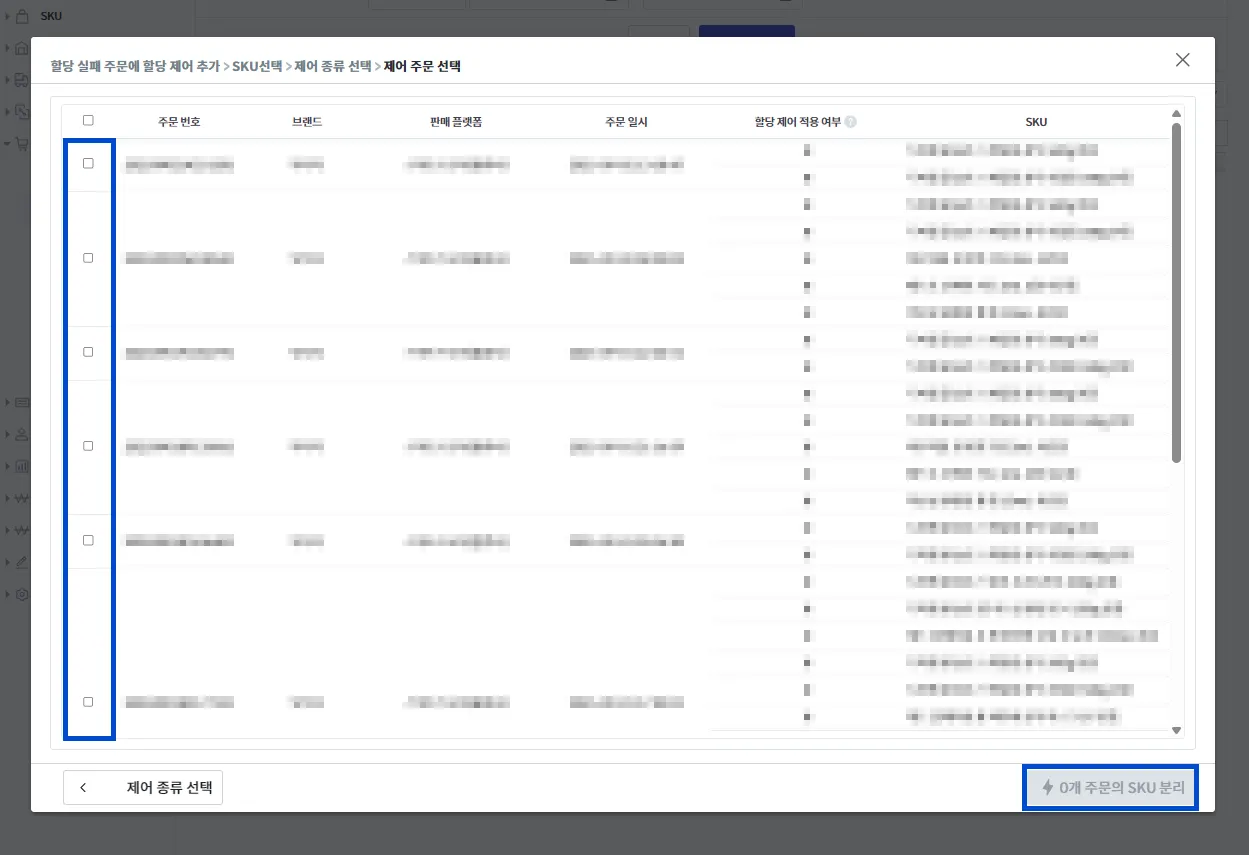 분리를 시도할 주문을 체크하고 [n개 주문의 SKU 분리] 버튼을 눌러주세요.