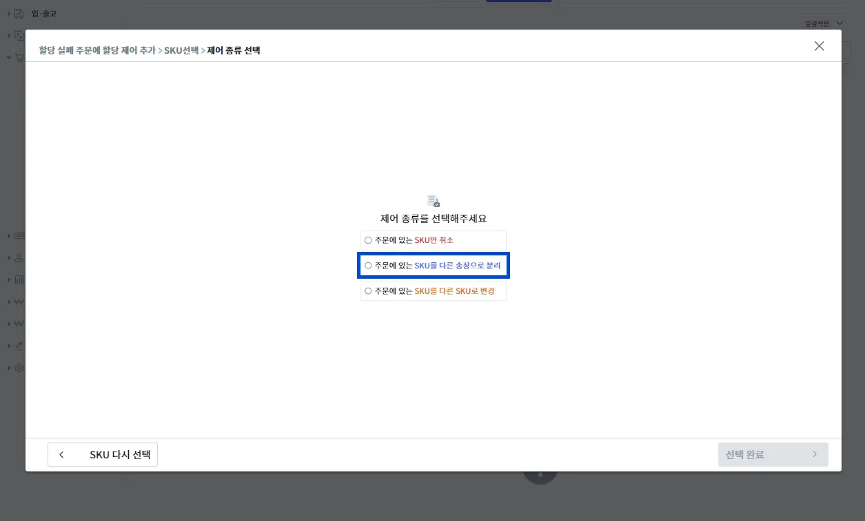 제어 종류 중 [주문에 있는 SKU를 다른 송장으로 분리]를 선택 후 [선택 완료]를 눌러주세요.