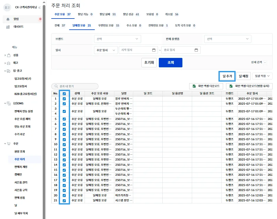 딜매칭 오류가 난 주문 건들을 체크하고 [딜 추가]를 눌러주세요.