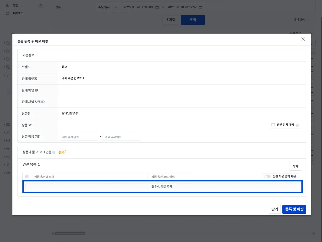 [상품 등록 후 바로 매핑] 팝업이 뜨면 [SKU 연결 추가] 버튼을 눌러 출고되어야할 품목을 설정해 줍니다.